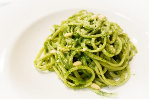 わさび菜のジェノベーゼを作っておけば、パスタに合わせるだけで絶品の味わいが楽しめる。作り方は、ミキサーやフードプロセッサーにざく切りしたわさび菜とオリーブオイル、にんにく、松の実、粉チーズ、塩を加えてペースト状にしておき、茹でたパスタに和えたら完成だ。