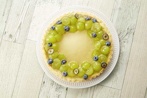 あらかじめ焼いてあったクッキー生地にカスタードを流して、シャインマスカットで飾っていこう。カスタードの黄色とシャインマスカットの緑色がよくマッチするタルトになる。カスタードクリームの代わりに、マスカルポーネを使ったチーズクリームを使っても美味しい。