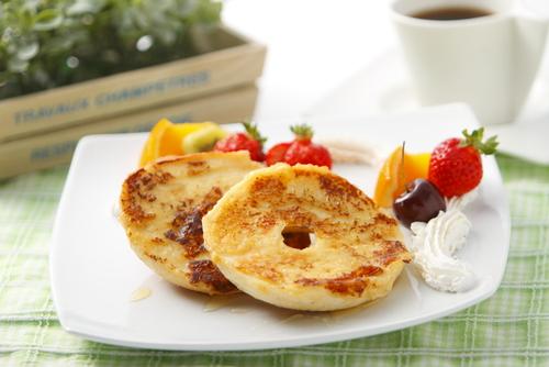 フレンチトーストは食パンやフランスパンなどを使って作るのが一般的だが、ベーグルを使っても作れる。スライスしたベーグルを卵や牛乳で作った卵液に数時間漬け、バターをひいたフライパンで焼けば完成。
