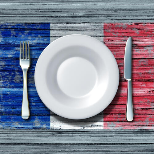 フランス料理では、ナイフ・フォークは外側から順番に使う。ナイフは右手(利き手)、フォークは左手(利き手と逆の手)に持ってそれぞれ人差し指を添えよう。食事中は、ナイフとフォークは八の字に、食事終わりには、ナイフは刃を内側、フォークは背を下にして皿の右下に揃えて置く。