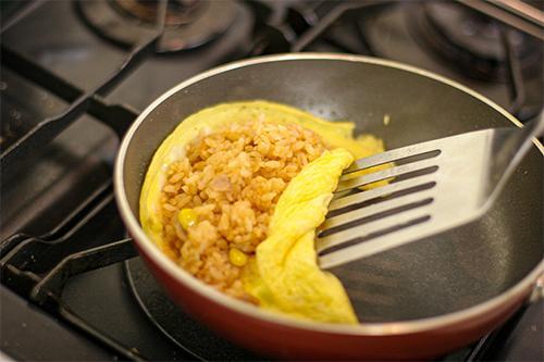オムライスをフライパンから皿に移す際に、チキンライスが卵からはみ出してしまうことがある。このような失敗を防ぐには、フライパンと皿をV字になるようにくっつけながら移すとよい。また、皿をフライパンにかぶせて返しながら移す方法も多く紹介されている。