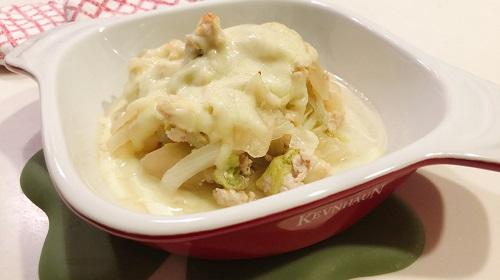 白菜は食べやすい大きさに切る。鍋に、白菜、ひき肉、牛乳、水、バターを入れて蒸し煮にしよう。耐熱皿に、蒸したひき肉と白菜を入れて上からチーズをのせる。チーズが溶けて少し焦げめがつくまでオーブンで焼けば完成。
