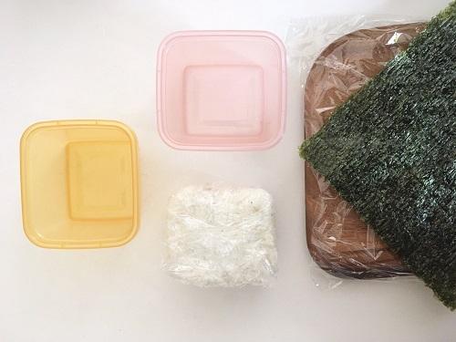 もっと簡単かつキレイに、おにぎらずの具を包む作り方がある。おにぎらずを作るとき、具を何種類か入れようとすると、うまく重ねられない場合がある。慣れるまでは、タッパーを使用する作り方がおすすめだ。海苔の大きさに合わせて、具材の大きさに合わせた四角いタッパーを選ぶ。