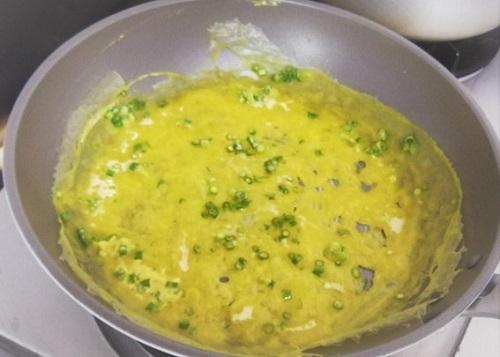 ミックス粉がない場合でも、片栗粉や上新粉、小麦粉などでバインセオの生地を代用できる。そのほか、ココナッツミルクやターメリックを用意し、水を加えればバインセオの生地の素は完成だ。写真のように、細かく切った万能ネギを生地に混ぜてもよい。ネギの香りや彩りのよさを楽しめる。