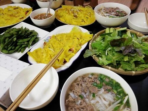 また、ほかの食べ方としては、サラダ菜には巻かず、バインセオだけで、タレに付けながら食べてもよいだろう。写真のように、今回はベトナムの代表的料理フォーと一緒にいただいた。ぜひ、献立作りの参考にしてもらいたい。