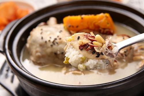 とてもよく煮込んであるので、鶏肉はホロホロと崩れ落ちてくる。その鶏肉をスープに浸しながら食べ進めていくのが一般的である。もち米や高麗人参なども出てくるので、雑炊をイメージしながら食べるとよいだろう。