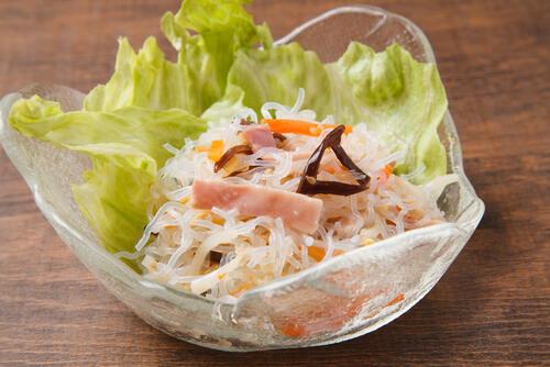 きゅうりやハム、きくらげなどの具材と春雨を、酢、しょうゆ、砂糖などの調味料で和えた中華副菜の定番料理。ほどよい酸味があり、箸休めにもぴったりだ。
