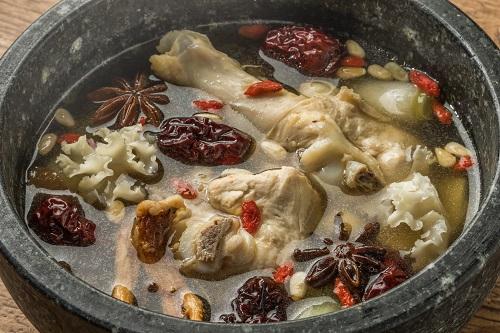 大きめの鍋に丸鶏と半量余っている高麗人参とナツメとしょうがを入れて、ひたひたになるくらいの水を入れる。沸騰するまで強火で煮ていき、沸騰したら弱火にしてアクを取りながら、3時間程度煮続ける。途中水を加えながら、丸鶏が水中にある状態を保ち続けるようにする。丸鶏が柔らかくなったら完成である。