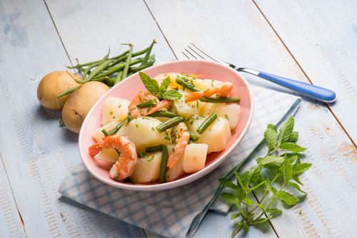次にシーフードミックスとじゃがいもをバターで炒めたおつまみを紹介しよう。用意するのは、じゃがいも・むきグリーンピース・塩・黒こしょう・オリーブオイル・バターだ。じゃがいもは皮ごと洗い厚さ5mmほどの輪切りか、大きいものは半月切りにし、サッと水にくぐらせ水気を切る。