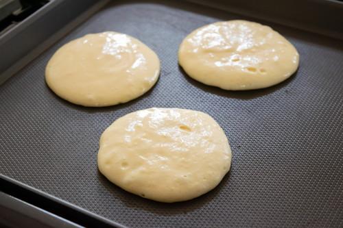 ホットケーキミックスと水だけの生地を焼く場合、ふたをしなくても作れる。しかし、大きめのふたではなく、小さめのふたをして焼くと弱火でも火が通りやすいのでおすすめだ。