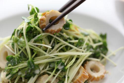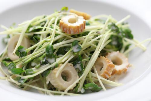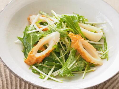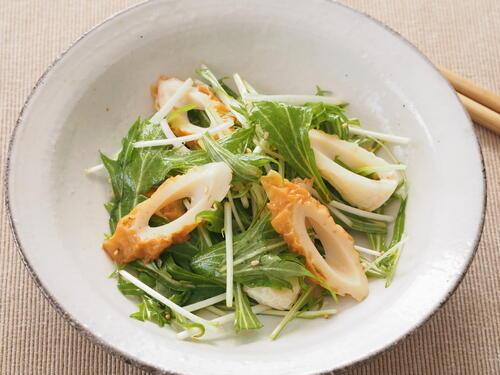 おすすめは、マヨネーズの代わりに、カロリーが低いドレッシングでちくわと野菜を和える食べ方だ。斜め薄切りにしたちくわ(1本30g)と根元を落として適当な長さに切った水菜(50g)を酢と醤油、ごま油で作ったドレッシングで和えれば完成。1人前あたり約94kcalと低カロリーでさっぱりとした美味しさが楽しめる。