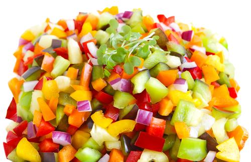 サラダを作る際にもあられ切りは役に立つ。この時のポイントだが、似たような色合いの野菜だけ使うのではなく、トマトやキュウリ、カボチャなどさまざまな色合いの野菜を使うとよい。より華やかな見た目のサラダを作ることができるだろう。