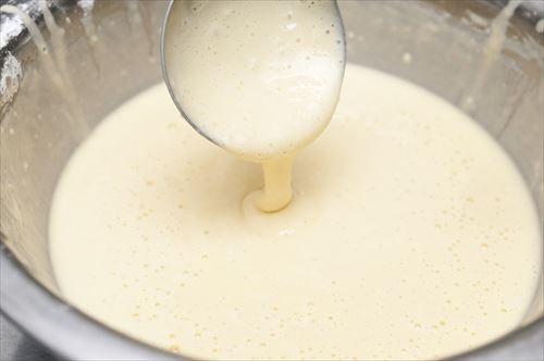 まず、炊飯器の内釜に薄くバターを塗り、強力粉を叩いてコーティングを行っておく。こうしておくことで、焼きあがった際に、キレイにチーズケーキを取り出すことができる。ボウルに牛乳と生クリーム、バニラエッセンス加えて合わせたら、薄力粉をふるいにかけて入れる。そこに角切りにしたクリームチーズを入れ、フードプロセッサーにかけておく。あとは、生地を炊飯器の内釜に流し入れて炊飯器のスイッチを入れる。焼きあがったら、指で軽く押してしっかりと固まっているか確認する。もしも柔らかくて固まっていないようなら再度加熱しよう。内釜ごと取り出して冷水に浸して冷まし、ケーキと内釜に隙間ができたら、ひっくり返して外す。