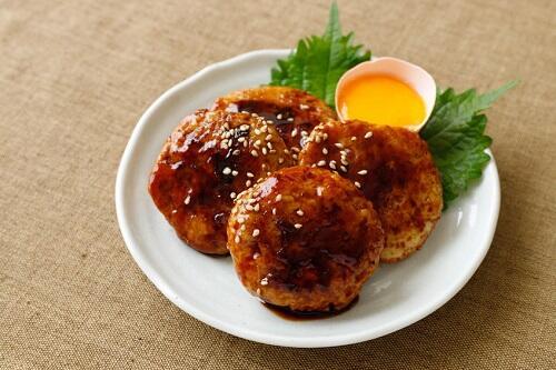 1. 卵黄を添えて!豆腐入りのふわふわ照り焼きつくね