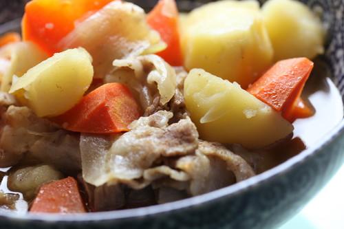 通常のにくじゃがと同じように具材をフライパンで炒めたら、水を加えて煮込む。アクを取り、白だしを加えて味がしみ込むように煮込んだら完成だ。