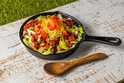 品数の多いホームパーティーなら、スキレットで作るタコライスも見栄えよくオシャレになるだろう。トッピングや食べ方はアイデア次第で無限大だ。