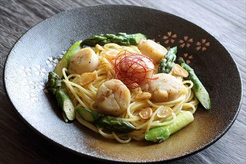 子どもも大人も喜ぶホタテとアスパラのメニューの極めつけは、なんといってもパスタであろう。ニンニクをきかせてシンプルに仕上げるとより食材の旨みを実感できる。