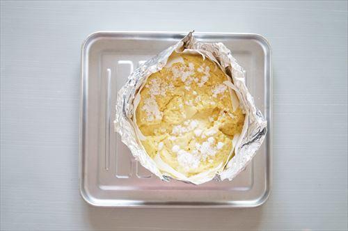 クリームチーズと砂糖、溶き卵、生クリーム、薄力粉、レモン汁を用意し、クリームチーズは常温に戻しておく。ボウルにクリームチーズを入れてよく混ぜたら砂糖を加え、さらに溶き卵、生クリーム、薄力粉、レモン汁を加えながら混ぜ合わせる。型を用意しクッキングシートを敷いたら、そこに生地を流し入れ、電子レンジで加熱する。生地を加熱したら型からクッキングシートごと取り出し、アルミホイルの上に置いて、砂糖をまぶしてトースターで焼いていく。トースターで焼くことで、表面の香ばしさが表現できるからだ。冷まして完成だ。