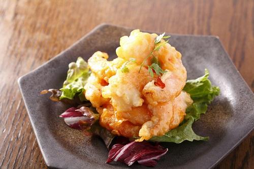 衣をつけたエビを揚げたらソースを絡める。しっかりエビの油を切ってからソースと合わせることで、衣にソースが絡みやすくなる。レタスなどを敷いた皿に盛りつけて完成。