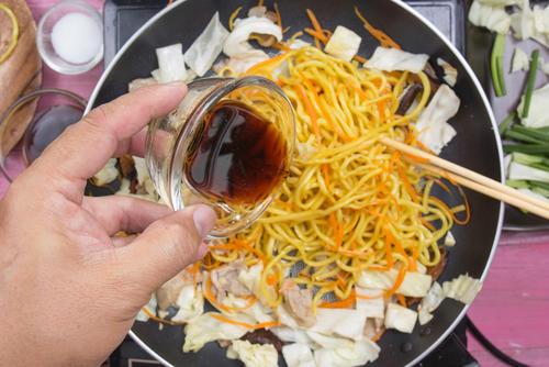 液体ソースは、水分と油分が多いため、調理時の水分量に注意しないとベチャっとした仕上がりになる可能性が高い。麺をほぐすために水を加えて調理する方法もあるが、液体ソースを使用する場合は、ソース以外の水分は加えずに調理するほうが、パラっとした仕上がりになる。