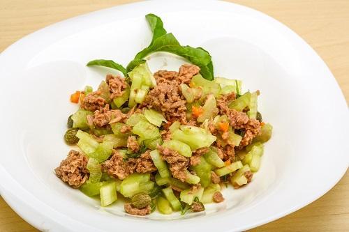 セロリの筋を取って薄切りにし、ツナとよく混ぜる。そこに出汁や調味料を加える。味付けはさまざまだ。たとえばかつお出汁やしょうゆで和風に、あるいは鶏ガラスープなどで中華風に、などが可能だ。なお、加熱するとセロリのかさが減るので、思った以上に量を食べられる。セロリをしっかり使い、一気に消費したい。