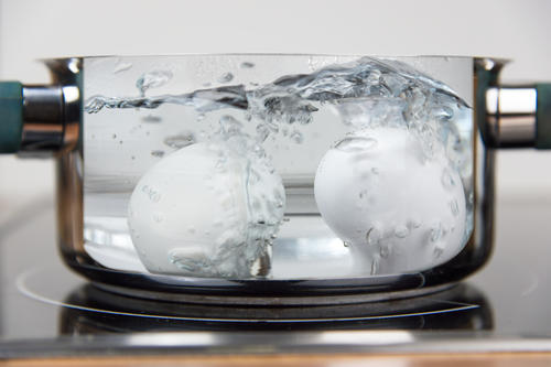 - 水に塩を少し入れて沸騰させる:沸騰したお湯に塩を入れると「突沸」とよばれる現象が起こり、ゴボゴボと煮えたぎる。その状態の中に卵を入れることで卵が自然と動き、白身の中の黄身の位置が偏ることがなくなる。また、塩を入れることで加熱のムラもなくなることも関係していると思われる。塩を入れた時に湯がとびちることもあるので十分に注意しよう。