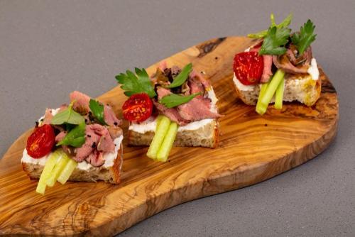 多少水分のある食材を使う場合、パンの上に直接のせるのではなく、ディップやチーズの上にのせるとパンがフニャフニャになるのを防ぐことができる。
