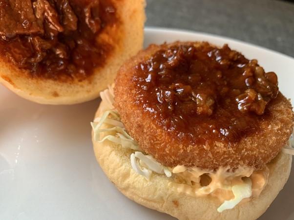 定番のグラコロ®︎は1つ409kcal。挟まれているのは、熱々のグラタンコロッケ。引き立て役になっているのは千切りのキャベツである。さらにソースは特製のコロッケソースと卵ソースの2種類。これが味に奥行きをもたらすゆえんである。バンズにはバターを加えてまろやかさをアップ。さらに蒸してふかふかに仕上げたものを使用している。