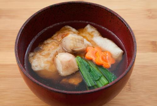 鍋にだしや醤油、みりんを加えてベースとなるすまし汁を作る。そこに鶏肉やほうれん草など好みの具材を加えて煮る。最後にこんがり焼いた四角い餅を入れ、かまぼこなどをトッピングすれば完成。コツは餅をこんがりと焼くこと。すまし汁の優しい美味しさに香ばしさが加わり、美味しく仕上がる。トースターなどでしっかり焼き色が付くまで焼いてから、すまし汁に加えよう。