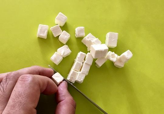 アラビアータ牛丼の準備ができたら、クリームチーズを角切りにする。1~2cm角くらいの好みの大きさにカットしよう。温度が上がると柔らかくなり切りにくいため、切る直前まで冷蔵庫に入れておき、包丁も冷やしておくとよい。