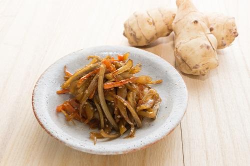 作り方・・・菊芋は太めの千切りにしてから水にさらしておく。にんじんは、細切りにする。フライパンにゴマ油をひいて菊芋とにんじんを炒めて、和風出汁の素、砂糖、醤油で味を調えて、白ゴマをふりかけたら完成となる。好みで、七味唐辛子を加える。シンプルだが、菊芋とにんじんを使った栄養たっぷりのきんぴらである。