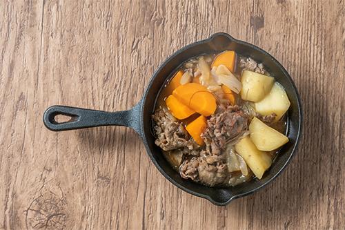 余った牛丼の汁の中に、じゃがいも、ニンジン、玉ねぎ、豚肉を入れ具材が柔らかくなるまで煮たら完成。煮込みすぎると、塩辛くなってしまうので注意。具材が柔らかくなったら火を止め、余熱で味をしみ込ませるとよい。汁の余り具合にもよるが、少しであればお弁当用にピッタリだろう。肉じゃがを煮込んでいる間にほかのおかずを作ることができる。