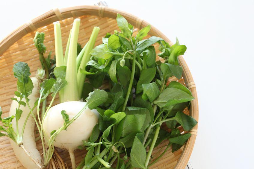 春の七草の種類には、スズシロ、スズナ、ホトケノザ、ハコベラ、ゴギョウ、ナズナ、セリが入る。七草の1つ1つには願いなども込められている。
