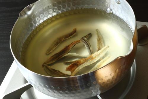にぼしで出汁をとる時の最適な量は、水1リットルに対して、にぼしは30gほど。まずはにぼしを入れて火にかける前に、水の状態でにぼしを入れ、出来れば一晩から半日は浸けておこう。その際ににぼしの身を半分に割っておくとさらに出汁が出やすくなる。いきなり火にかけてはいけないのかという人もいるかもしれないが、水だしをおこなうことで、にぼしの雑味や苦みのないすっきりとした出汁になるのだ。