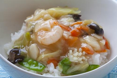 休日の昼などにもぴったりのボリュームメニューは、エビとチンゲン菜で作ったあんかけ丼はいかがだろうか。最初にエビとしいたけを炒め、チンゲン菜を入れたらオイスターソース、鶏がらスープの素などで味付けをしていく。片栗粉であんかけにしたら、白いごはんにかけてできあがり。