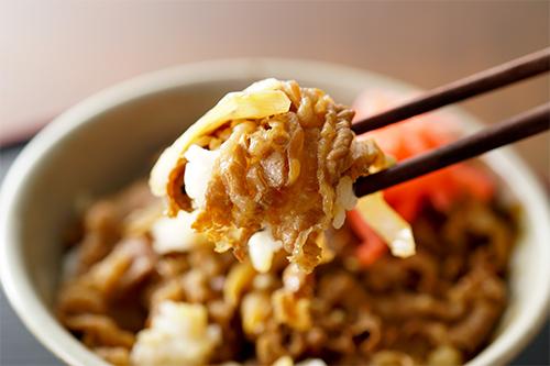 牛肉は柔軟で弾力性があるが、加熱によってさらに弾力性が増し、硬くなる。また、出汁の浸出によって肉の中の水分量が減り、硬さが増すのだ。作り置き調理の際には、肉の部位によっても加熱の温度を調整するとよいだろう。牛丼には、牛ばら肉や切り落とし肉が使われることが多い。どちらも薄くスライスされているため、短時間かつ煮立たない程度の火加減での調理をおすすめしたい。作り置きの再加熱時は、食中毒にも気を付け、低温で牛丼の具をじっくり加熱するようにするとよいだろう。