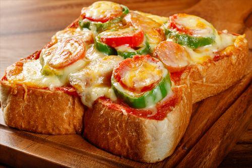 ベーコンは短冊切り、ピーマンは輪切り、ミニトマトは半分に切っておく。食パンにピザソースorケチャップを塗ってから、ベーコン、ミニトマト、ピーマン、スイートコーン、ピザ用チーズをのせて、トースターで焼いたら完成となる。