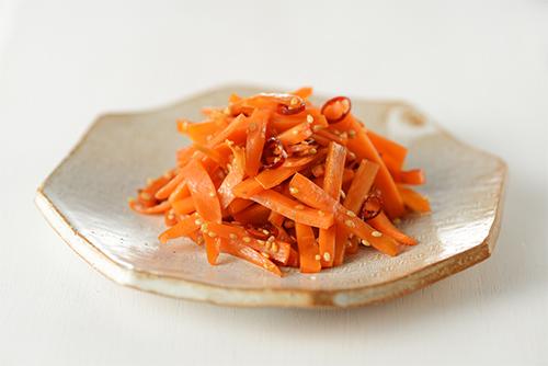 スライサーで薄くむいた人参を鍋に入れ、醤油と砂糖、酒を合わせて弱火で蒸し煮にする。人参がしんなりしたら、強火で混ぜながら煮詰めていく。火を止め、ごま油とすりごまを加えれば完成だ。彩りよく、栄養価も高いため、牛丼弁当にはぴったりの付け合わせだろう。