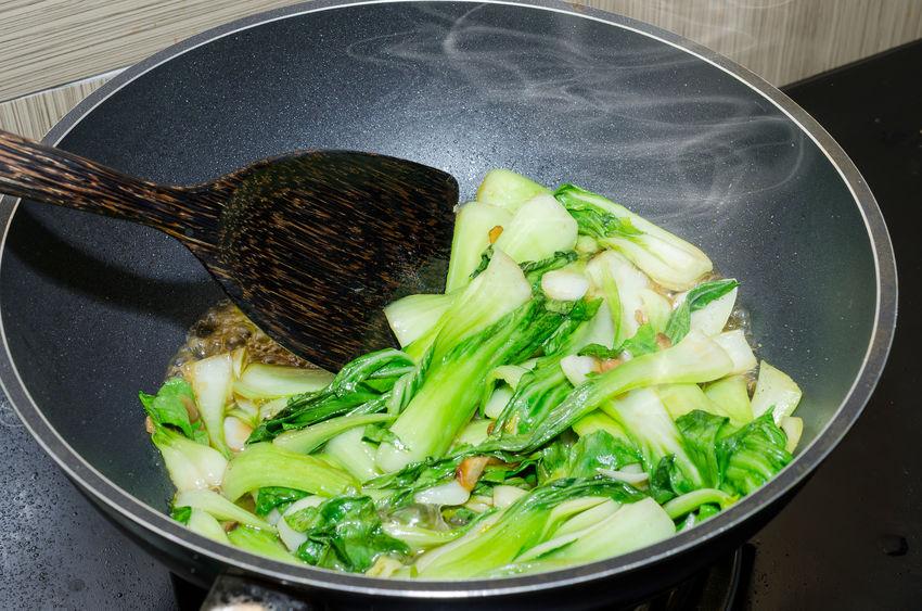 チンゲン菜の葉は炒めすぎるとクタっとなってしまう。そのため手際よく炒めていくのがよいだろう。最初にカットしておき、目を離さずに炒めたい。