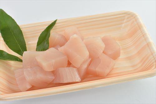 薄いピンク色で脂がのっており、食感はやわらかで加熱してもかたくならずジューシーな刺身のメカジキハラモだ。