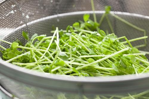 豆苗で食べられる部分は葉と茎の部分だ。パッケージから取り出したら、流水でさっと洗い豆と根の部分を切り落として半分に切る。フライパンにごま油を入れて熱し、卵を流し入れて半熟状になったら取り出しておく。再び同じフライパンにごま油を入れ、刻んだ生姜を炒め、豚肉ともやしを入れて中火で肉に火が通るまで炒める。