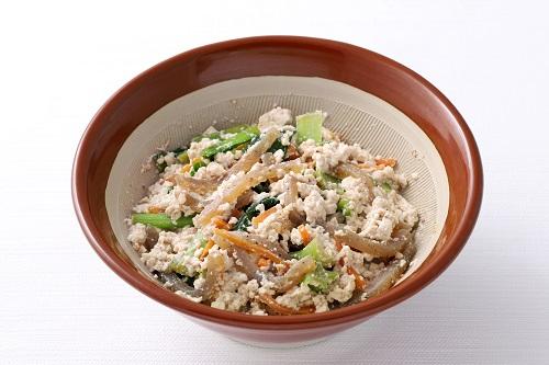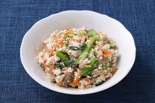 作り方は、小松菜は3cm幅程度に切り、にんじんは細切りにして、下茹でしておく。木綿豆腐は水切りをしておく。木綿豆腐を潰しながら、白すりゴマ、砂糖、醤油、和風出汁の素と混ぜ合わせて、小松菜とにんじんを加えたら完成となる。