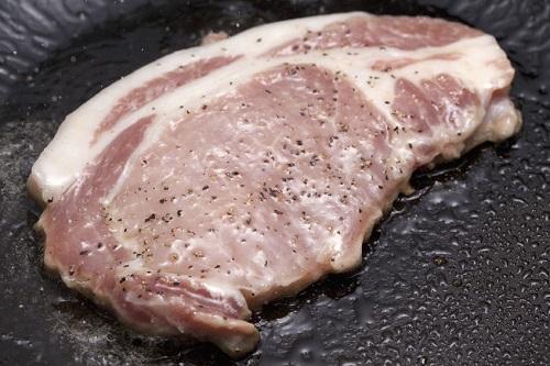 豚の厚切り肉を焼く前に、赤身と脂身との間にある筋を包丁で切る「筋切り」を行う。筋切りすることにより、肉が硬くなってしまうことや反り返りを防げる。基本的には、赤身と脂身の間に4~5ヶ所包丁を入れればOKだが、より柔らかくするには包丁の背で叩きながら全体的に筋切りをしてもよいだろう。筋切りをしたら塩こしょうをふって下味を付ける。