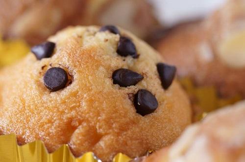 ホットケーキミックスと卵、牛乳、砂糖、バターまたはサラダ油で基本の生地を作り、チョコチップを加えて混ぜ込む。さらに、カップに生地を流し入れたあと、チョコチップをトッピングするようにのせると、焼き上がったときの見栄えがよくなる。