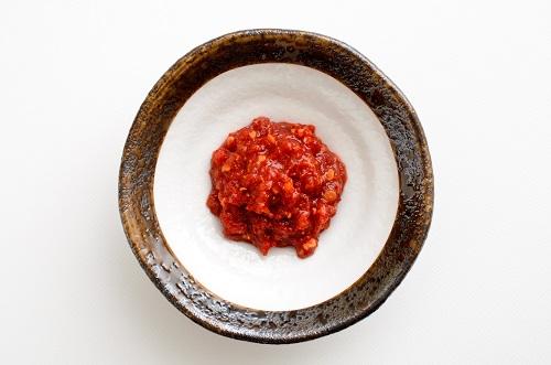 コチュジャンと酢、おろしにんにく、醤油、砂糖、ごま油、すりごまを混ぜてユッケのタレを準備する。基本的には肉や魚を作るときと変わらないが、濃厚なアボカドをさっぱりと楽しめるように酢を入れる。コチュジャンの量で辛みを調整できるので、辛いのが好きな人は多めに、逆に苦手な人は少なめにしよう。
