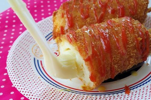 作り方のポイントは、さけるチーズを使うこと。これにより揚げる際にはチーズが溶けて流れ出すことが少なく、食べた時にはよくのびるのだ。