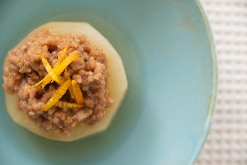 ふろふき大根には、食べごたえのある肉味噌ダレも定番だ。レンジで簡単に作る方法を紹介しよう。耐熱容器にひき肉、みじん切りにした生姜、味噌、みりんを入れて、ラップをせずにレンジで加熱する。火が通ったらよく練り混ぜて完成だ。