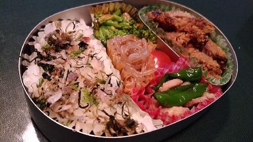 娘は米好きなので主食はだいたいご飯ですが、白が多すぎるのはいやなので、じゃこやふりかけ、混ぜご飯にすることが多い。たまにはサンドイッチ、ペンネのミートソース、夏だとそうめんや冷やし中華もしました。