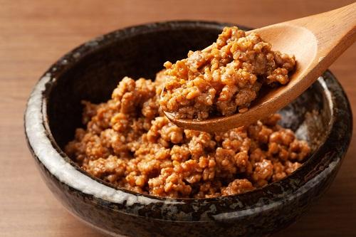 レンジで作れる肉味噌の調理法を紹介しよう。耐熱容器に、鶏ひき肉・生姜・酒・片栗粉・みりん・味噌・水を入れ混ぜ合わせる。ふんわりとラップをかけ、レンジで加熱しては混ぜ、ひき肉全体に火が通るまでこの工程を繰り返そう。これだけで、あっという間に甘辛な肉味噌のできあがりである。