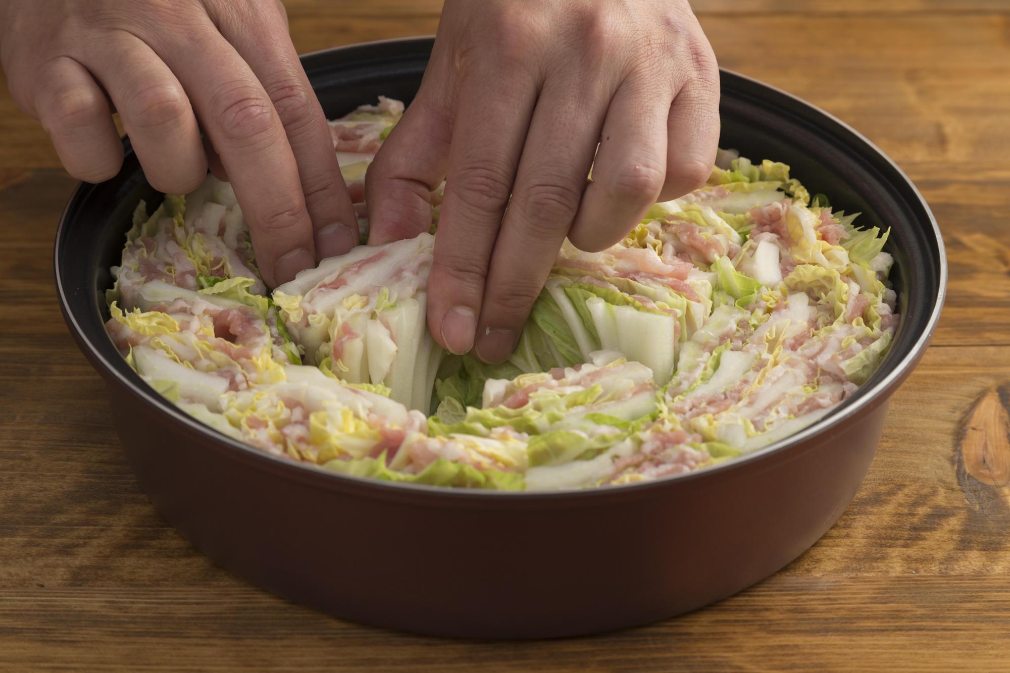 白菜の葉の部分はざく切りにして、芯の硬い部分はそぎ切りにするとよい。豚肉も一口大に切っておく。鍋に白菜と豚肉と白だしを入れて、火にかけたらふたをしておく。しばらく煮ることで白菜から水分がしっかりと出てくるので、かき混ぜる。豚肉に火がとおり、白菜がしんなりとしたら完成となる。